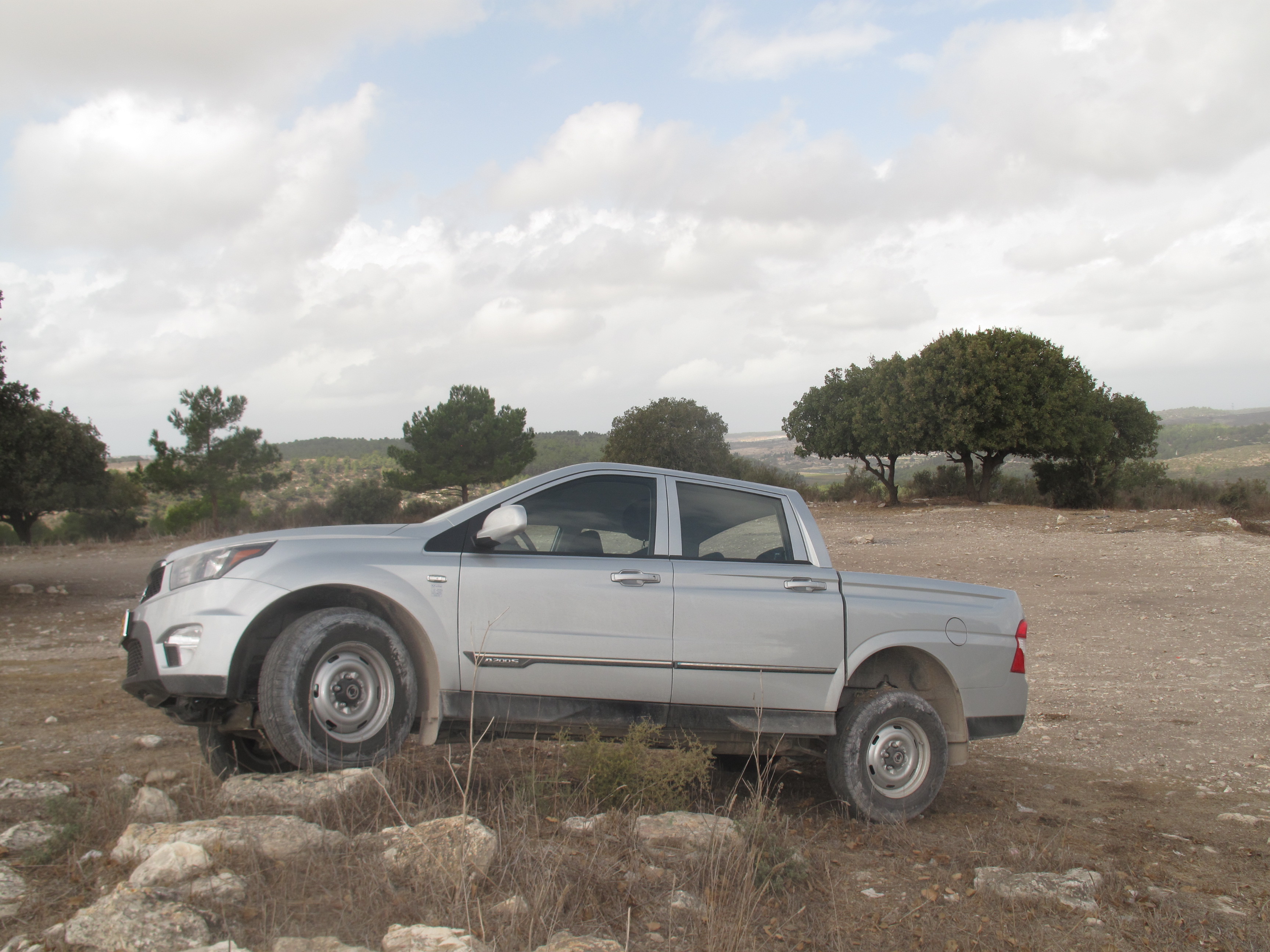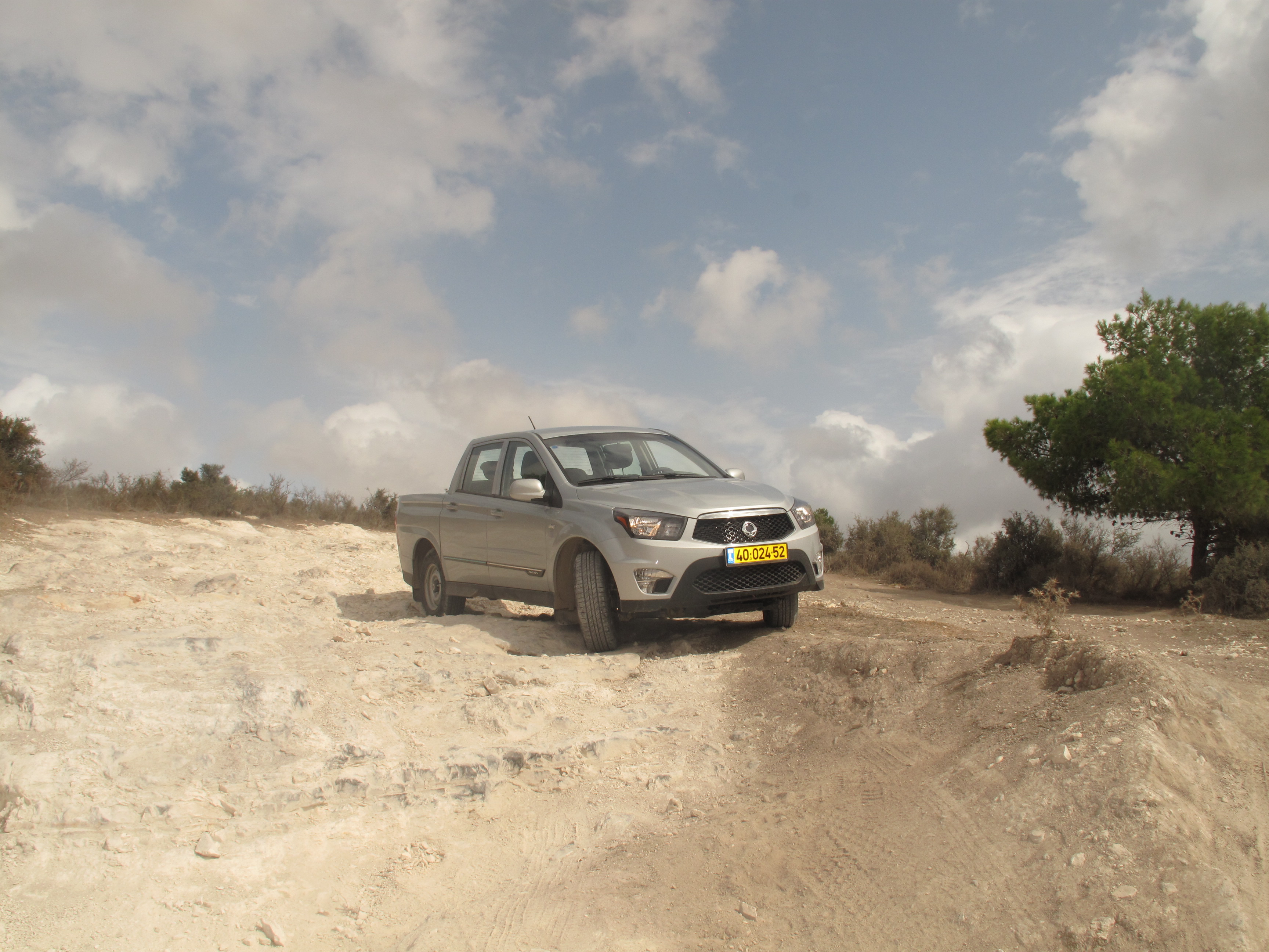 אני משלב ליחס העברה נמוך, Low, ומתחיל בטיפוס איטי. במצב Low דוושת הגז נעשית עצבנית ודורשת הסתגלות. כשאני מגיע למדרגה הראשונה המשלבת אחיזה בעייתית והצלבה חריפה הטנדר נעצר. גולש אחורנית ומנסה בשנית ובשלישית וברביעית ולא מצליח. כל פעם שאני מגיע ל'בור' בצד ימין, מערכת בקרת המשיכה לא מצליחה להתארגן על עצמה והטנדר נעצר. מוותר ומנסה לטפס בצד השמאלי, על הסלעים. כאן אין הצלבה אבל צריך כוח מנוע בריא ואת זה יש לאקטיון. עבודת גז עדינה ביחד עם הכוונה טובה ואנחנו בראש הגבעה. ברגע זה השמיים מעוננים קלות והאוויר נקי. ביחד נוצרת תאורה מצוינת לתצפית ולצילום.